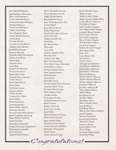 Congratulations!Jose Antonio RodriguezJulia Rodriguez-HernandezJulissa Atziri RodriguezNatalia Isabel RodriguezNathaniel Enrique RodriguezNicholas RodriguezYasmin Itzel RodriguezAaliyah Anahi RojasAlexa Margarita RojasNatalia Michelle RomeroAdrian RomoGermann RosalesLeeandra Yvonne RosalesAdnilem Nicole RosalezJacob Rafael RosalezFrancisco Rosas Jr.Samantha Marie RosenbaumNathan Isaac RostroIsidoro RubioAlejandra RuizLizeth RuizJoseph Uriel SaavedraVictoria Dori SaenzBriana Marie SalasEduardo Salazar-MorenoEstiben SalazarKaylie Faith SalazarRene SalazarYoli Elaine SalazarBrenden SaldanaNatalie SaldanaCameron Lee SalinasDaisy SalinasSheyla SamaniegoArmando SanchezBrayan Eulises SanchezDarien Jay SanchezDevanahi Alejandrina SanchezJaime Guadalupe Sanchez Jr.Brian Matthew SandovalSusana SandovalMario Josue Santana IIRogelio Santayygo DragustinovisMark Anthony SantillanJavier Santos Jr.Angel Deshawn SantoyoXavier Alexander SaucedaSevero Ponciano SaucedoAshley Nichole SeguraBryan Salvador SeguraJorge Alessandro Segura MarLorena SeguraJesus Antonio SerrataEvelyn Paige ShaferNicole Ashley Sierra-NavarroJenissa Skyy SilesAndrina Camille SilvaDevin SilvaJury Melissa SilvaAlexa SolisAlexis SolisNicholas Alejandro SolisReynaldo SolisTommy Leroy SolisRyan Nathaniel StokesChris Martin Tamez HernandezDavid Roberto TamezGerman Antonio TamezIsrael Tejada SanchezDaniel TiradoAlexis TorresJenna Jolie TorresNicolas Gabriel Torres-GuzmanSamantha Marie TorresJeremiah Nicholas TrejoMark Anthony TrejoArcadio TrevinoEvany Janae TrevinoNicholas Domingo TrevinoRafael TrevinoRamiro Trevino Jr.Rene Leroy TrevinoJesus UrbinaMaria Concepcion UriegasEliseo Valdez GonzalezJaney Lizbeth ValdezMaria De La Luz ValadezKayleen Nevaeh ValladarezJohnny Joe Valenzuela Jr.Daniel VargasDennis Adriana VargasKaylee Brianda VargasMikayla VargasMonica Lanette VargasAdolfo Antonio Vasquez NietoCarlos Alberto Vasquez Jr.David Justin VasquezEmily Yamileth VazquezIsaac Miguel Angel VasquezJeremiah Alfonso VazquezJesus Vasquez NavarroJose Alfredo Vasquez Jr.Maria De Jesus VasquezMariah Sophia VasquezOscar Ivan VazquezRaidan Alexander VasquezMaria Belen VegaJomar VelaLyam Alonzo VelizKrystal VeraYoselyn VieyraAiden Joseph VillafrancaAzael Ramon VillafrancaEmmah Mya VillafrancoJayden Rene VillafrancoEduardo VillanuevaManuel Alfonso VillanuevaAngelo Orlando VillarrealBeatrice Adriana VillarrealJacqueline VillarrealJose Rene Villarreal IIIAdrian Ethan VillegasMaite VillegasJose Martin ViveroAva Rose WalkerDerik Ryan YanezMarco Antonio YanezIsaac Jo YbarraLuke Ryan YbarraMarissa Ann Ybarra SandovalDavid YsaguirreRosselyn ZamarripaJeremiah Joel ZamoraAliana Lov ZavalaFrancisco ZavalaJayden Elijah ZavalaDiego ZunigaKassandra Emily ZunigaKassandra Zuniga