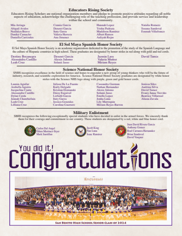 Educators Rising Society Educators Rising Scholars are national organization members and pledge to promote positive attitudes regarding all noble aspects of education, acknowledge the challenging role of the teaching profession, and provide service and leadership within the school and community.El Sol Maya Spanish Honor SocietyEl Sol Maya Spanish Honor Society is an academic organization dedicated to the promotion of the study of the Spanish Language andthe culture of Hispanic countries in high school. These graduates are designated by honor stoles in red along with gold and red cords.Science National Honor SocietySNHS recognizes excellence in the field of science and hopes to engender a new group of young thinkers who will be the future of industry, research, and scientific exploration for America. Science National Honor Society graduates are designated by white honorstoles with the Science NHS logo along with purple, green and gold honor cords.Military EnlistmentSBHS recognizes the following exceptionally special students who have decided to enlist in the armed forces. We sincerely thankthem for their courage and commitment to our country. These students are designated by a red, white and blue honor cord.Lauren AguilarArabella Aguirre Jacqueline Cantu Alessandra Castillo Dylan Cerda Jennah Chamberlain Leah Cruz Lilliana Cruz Carlos Del AngelEthan Martinez-Styer Mark SantillanJuan David Rivera GarciaAnthony Gomez Roel Carranza Hernandez Brian Sandoval David Vasquez Jacob KingYan Luna Isaac RamirezJulissa De La Fuente Kaily Delgado Kristian Domanski Daisy Esquivel Lizbeth Garcia Itaty Garza Jessica Gonzales Carolina Guerrero Cassandra Guzman Nathan Hernandez Alexis Jalomo Solanii JassoEstella Lopez Jonha Luna Lily Marroquin Miriam Reyes-Barron Jenissa Siles Andrina Silva David Tamez Evany Janae Trevi%u00f1oBeatrice Villarreal Aliana Zavala Destiny BocanegraAlessandra Castillo Leah Cruz Deseret Garcia Alexis Jalomo Solanii JassoJazmin Lara Valeria Mu%u00f1oz Miriam Reyes David Tamiz Mia ArriagaAbigail AvalosNeidalyn BravoDanika CamachoDaniella Carrizales Connie GarciaDeseret Garcia Itaty Garza Valeria HerreraAna Jimenez Hannah LopezTrisha Pedraza Maddison Ramirez Albert Ramos Aaliyah Rojas Natalia RomeroSusana SandovalEmmah Villafranco